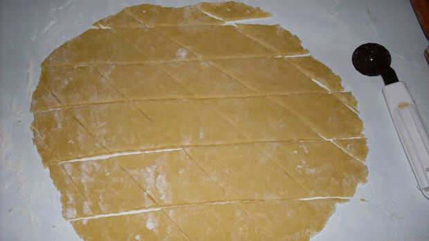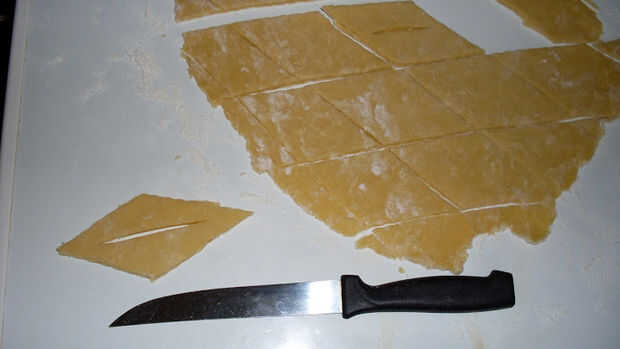 Rodillo plana cada bola de masa y como se muestra en la imagen (rodajas de /baklava de diamante).