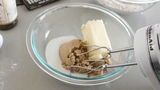 Ingredientes:11 cucharadas de mantequilla sin sal, ablandada1 taza de azúcar morena, llenado1/2 taza granulado de azúcar2 huevos grandes1 cucharadita de vainilla1 cucharadita de bicarbonato de sodio1/2 cucharadita de sal2 1/2 tazas harinachocolate se