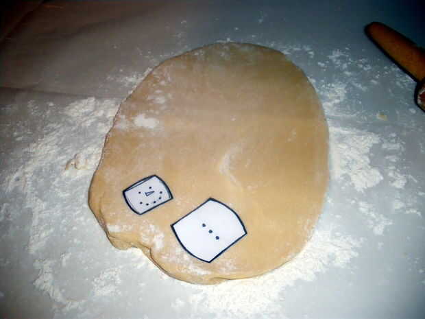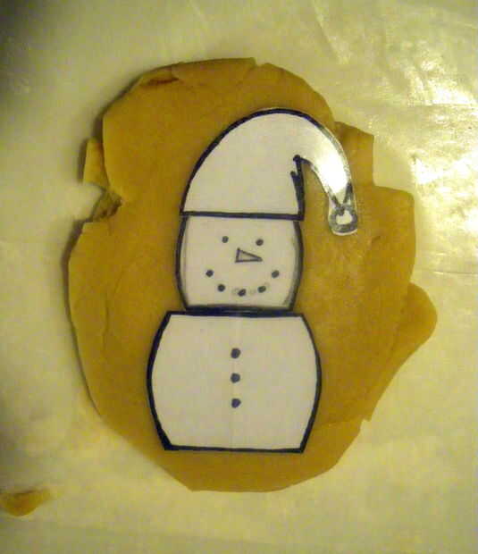 Ya que no tengo un cortador de galletas que las formas que yo quería para mis muñecos de nieve, hice plantillas. Para hacer esto, llamo a mi diseño en el papel de la impresora normal, blanco. Corte el diseño hacia fuera y el papel de contacto lugar en ambos lados. El papel de contacto no es necesario, pero me permite guardar y reutilizar Mis plantillas. Hizo una pieza separada para la cabeza y el cuerpo de cada muñeco de nieve y ponerlos juntos en la masa si quería crear un muñeco de nieve completo. Corte alrededor de las plantillas y colocar las galletas en una hoja de galleta alineada pergamino. Hornee a 375oF de 8-9 minutos. Las galletas más grandes pueden tardar hasta 20 minutos. Las cookies se realizan cuando están doradas en la parte inferior. Deje enfriar las galletas sobre una rejilla.