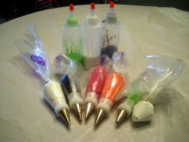 Dividir el glaseado en envases separados para ser coloreado.  Usar colorante alimenticio para obtener los colores deseados (en este caso blanco, negro, naranja, rojo y verde).  Mezclar bien y dejar el conjunto. Permitiendo la guinda al conjunto, ayuda a los colores desarrollar y convertirse en el más oscuro y más vivo.  Asegúrese de establecer algunos de los espeso, incoloro hielo a un lado para ser utilizado como el pegamento cuando es el momento de montar a la S'mores!