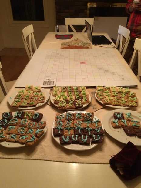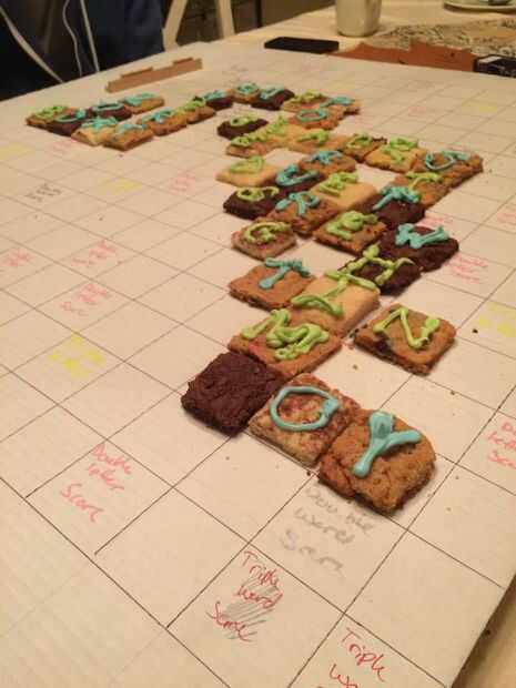 No tenemos el espacio para escribir números en la parte inferior de las galletas así que esto es donde el real scrabble azulejos vienen en práctico. No puede alcanzar en una bolsa y sacar galletas heladas demasiado fácilmente, así que agarró azulejos normales para ver nuestras cartas y cuando estábamos listos para jugar una palabra, nos cambió a nuestros azulejos para las galletas y observó un puntaje para esa palabra en el lado de la Junta.