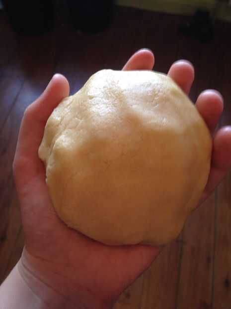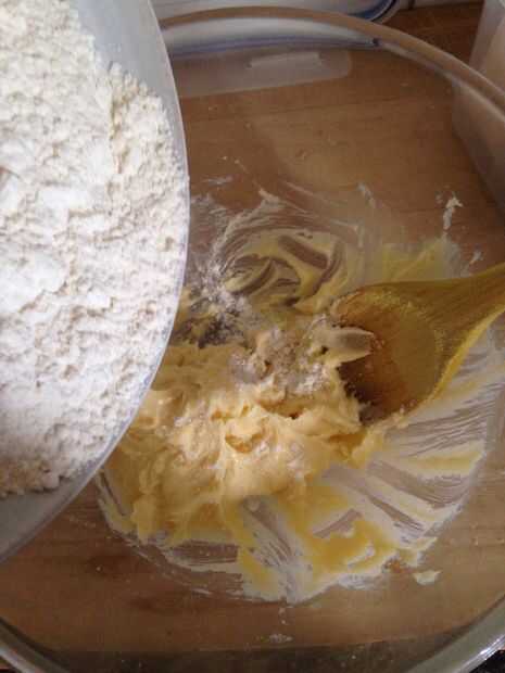 • A continuación, poco a poco añadir la harina y use sus manos para amasar la pasta de mantequilla con la harina. • Una vez que la masa empieza a crumble y caída aparte, agregue la leche y continuar amasando hasta que la masa es todos junta.