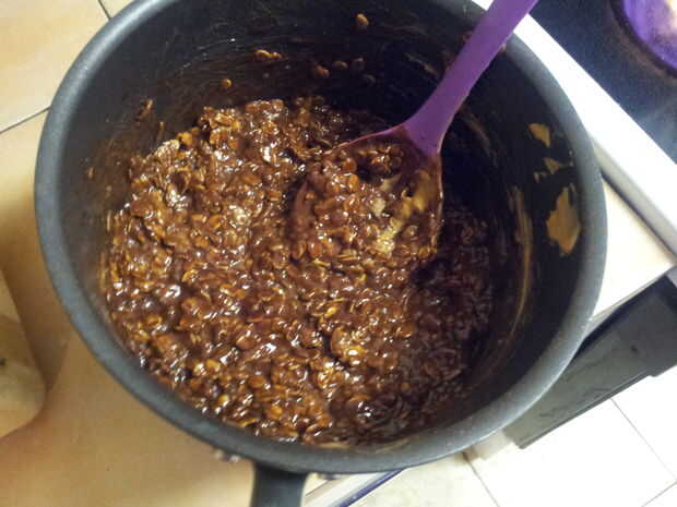 Inmediatamente añadir la avena, la vainilla y la mantequilla de maní. Mezclar bien pero rápidamente! Mezcla debe estar caliente para formar las galletas. Usted puede volver a calentar pero solo el tiempo suficiente para calentar todo, no lo suficientemente largos para cocinar ya.