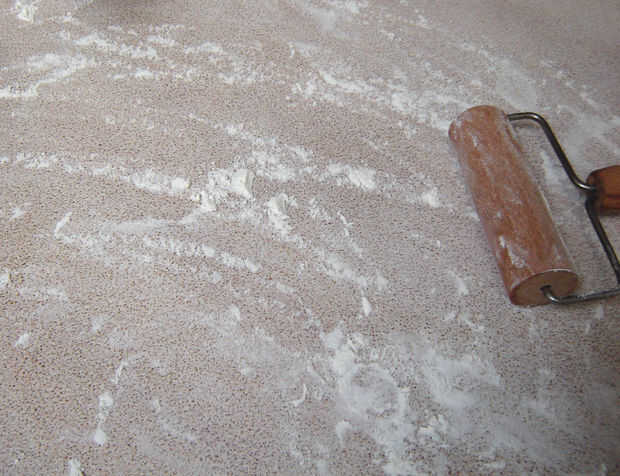 Espolvoree harina sobre la superficie de trabajo, rodillo y cortadores de la galleta.