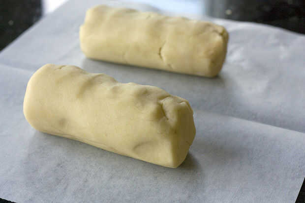 Sin refrigeración enrolle la masa en pequeños cilindros, luego transferirlos a su prensa de galletas y formar formas deseadas sobre una hoja para galletas sin enmantecar.