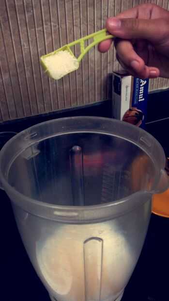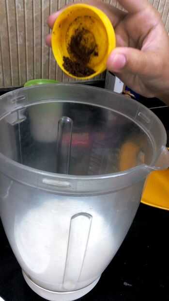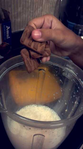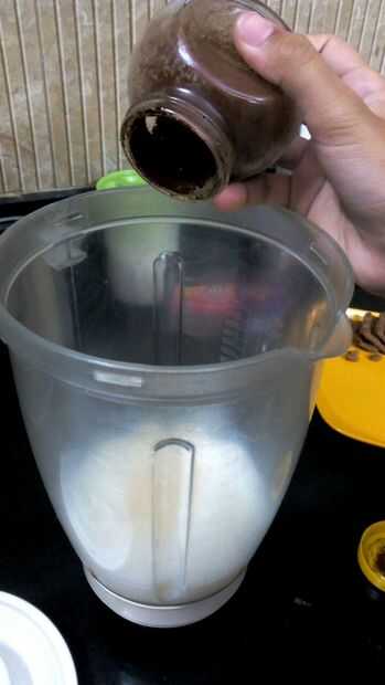 Mezcla, leche, azúcar, café y galletas en la batidora.