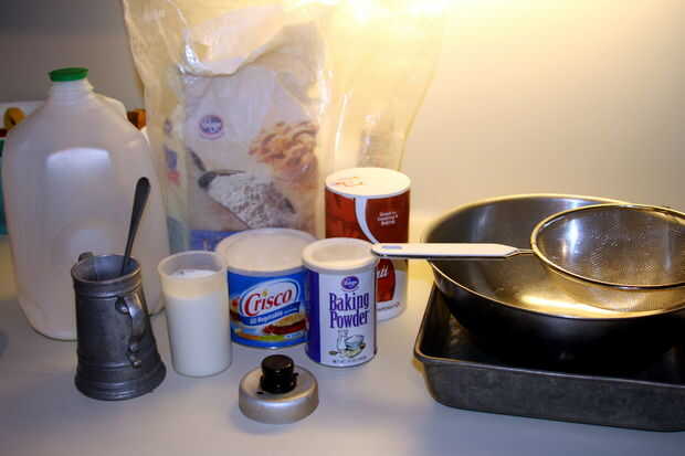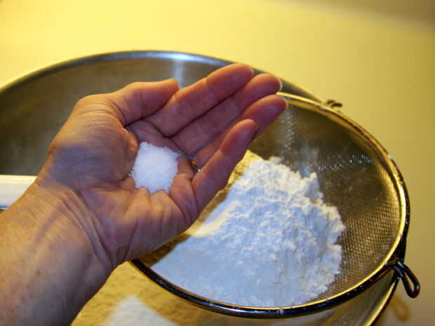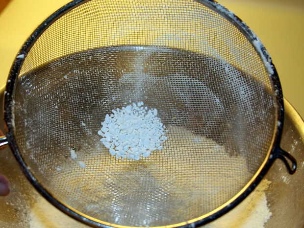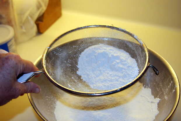Puede usar un tamiz para cernir la harina y la sal, el bicarbonato de sodio. Últimamente uso un colador de malla de alambre. Funciona igual de bien y más rápido también! Y más trabajo, más rápido llegar a comer.