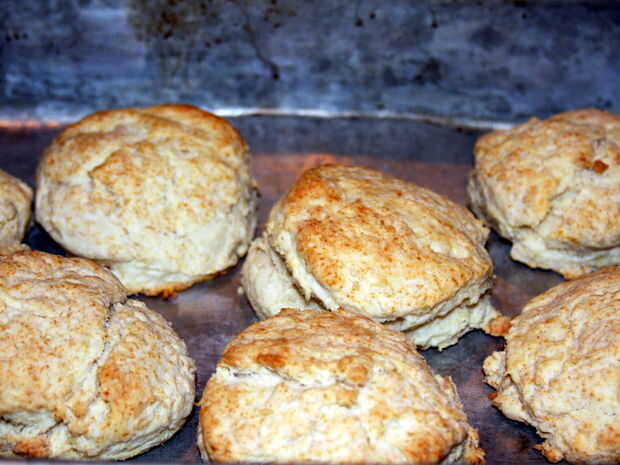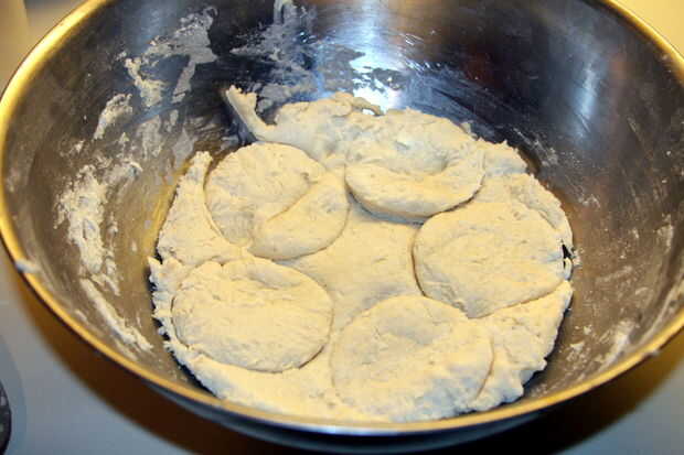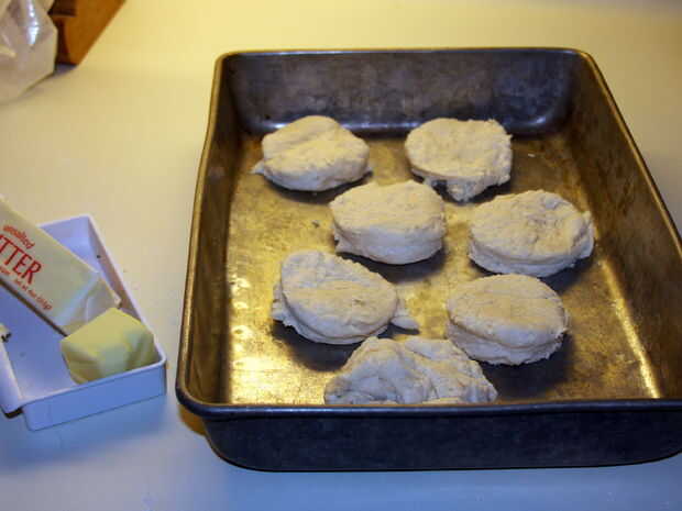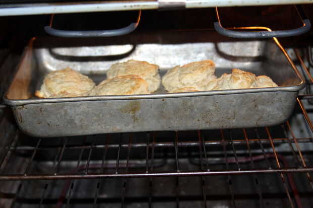 Luego use un cortador de la galleta (o puede utilizar un vaso pero no me gusta eso--demasiado gruesa) para cortar algunas galletas y plop en una sartén. Tengo una bandeja de galletas. Mi esposo es infierno (sin palos de hockey) cuando utiliza mi pan galleta para cocinar otra cosa, especialmente algo grasiento. Infierno tiene no hay furia como una mujer sur cuyo pan galleta ha sido profanado.