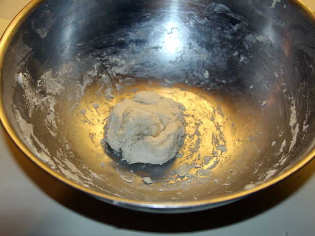 Luego pulsa abajo de plano en su cuenco con las manos para que sea 1/2 espesor. Sí, he dicho con las manos. No es necesario sacar el perno de balanceo, ni transferir a una tabla enharinada o lo que sea. Sólo utilice el recipiente y presione hacia fuera con las palmas de las manos para que sea uniformemente gruesa.