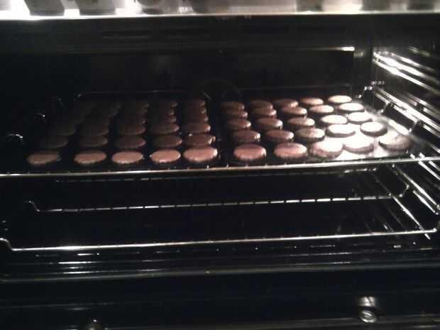 agregue la mantequilla y el azúcar marrón y blanco en un tazón grande Utilice un batidor eléctrico a crema la mantequilla y azúcar, batir en huevo, tamizar harina y cacao, de la hornada del rodillo la mezcla alrededor de 1cm, cortar con un cortador de la galleta, poner en una bandeja engrasada, poner en el horno y hornear durante 15-20 minutos, enfriar sobre una rejilla de alambre , una vez frío hielo, crema 1 cucharada de mantequilla, añadir 1 taza de azúcar glas, añadir la cucharadita de agua hirviendo y gota de vainilla, mezclar hasta suave y cremoso, poner la guinda una galleta, y luego una galleta en la parte superior.