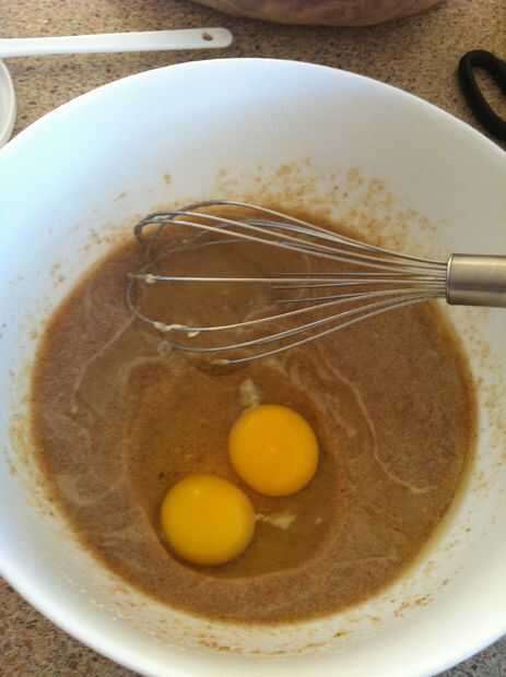 En primer lugar, precalienta el horno a 350. Crema juntos ambos azúcares, el aceite y la mantequilla. Luego agregar los huevos.