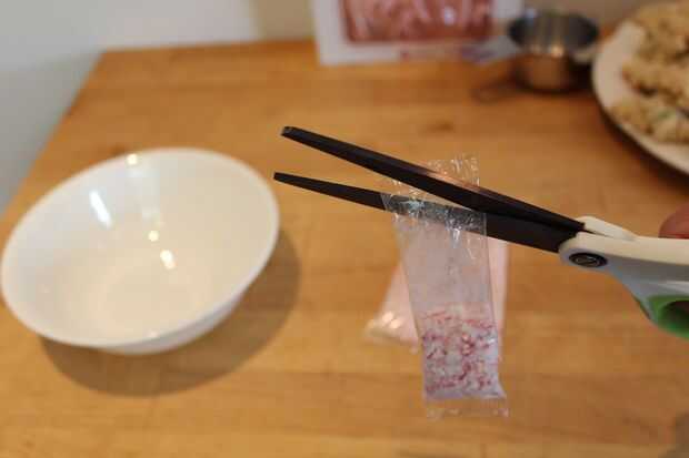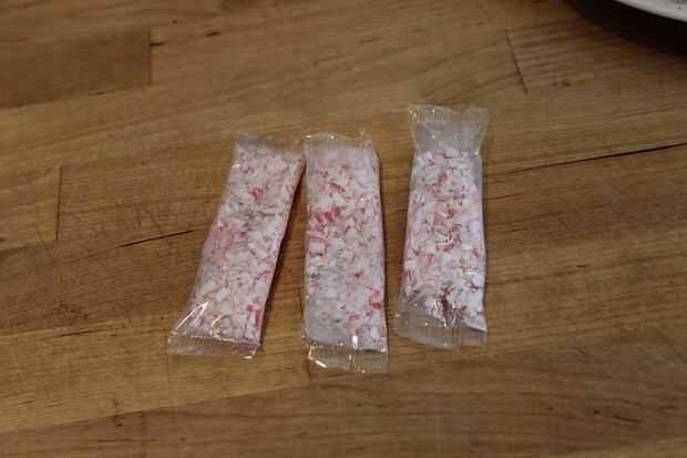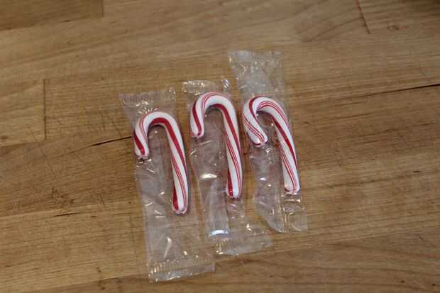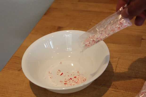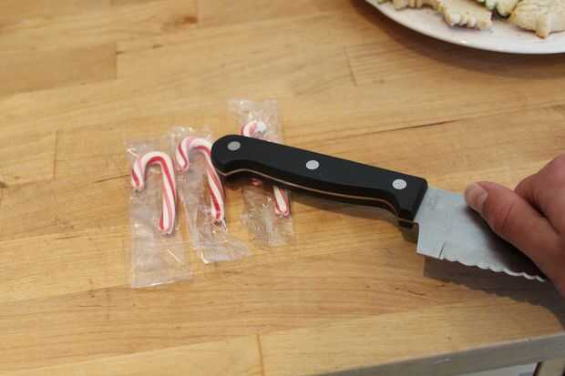 Bastones de caramelo Smash en sus contenedores con el mango de un cuchillo de cocina, o algo plano y similares. Véase el cuadro para qué bastón de caramelo debe parecerse después de machacar.