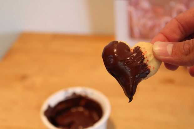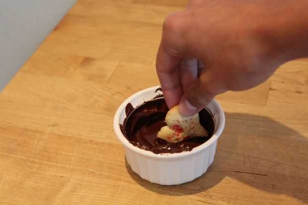 Sumergir en el chocolate con la mano para cubrir aproximadamente 3/4 de la cookie (dejar espacio para espacio de dedo).