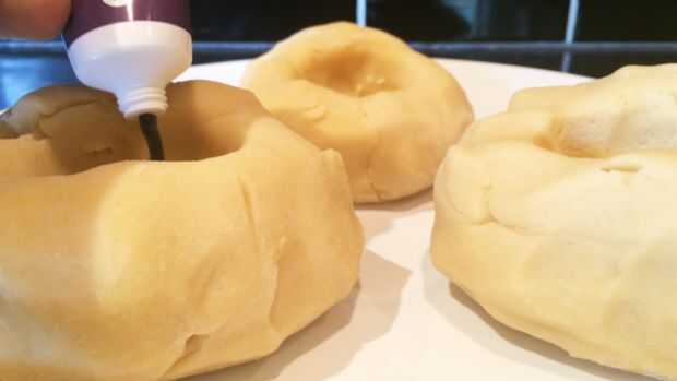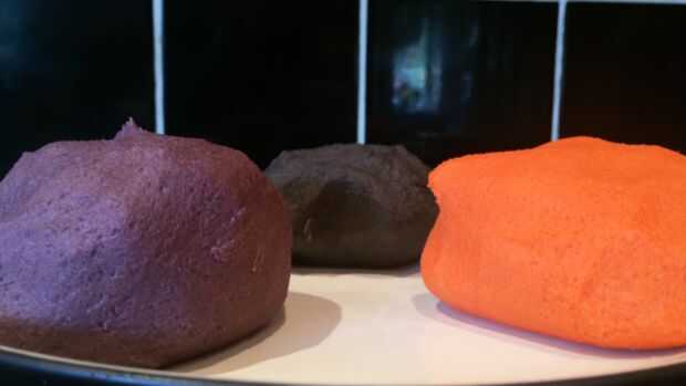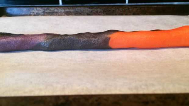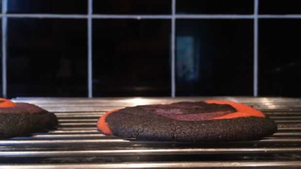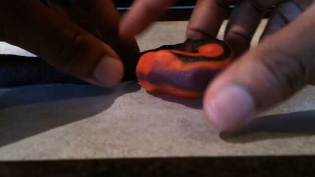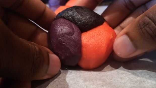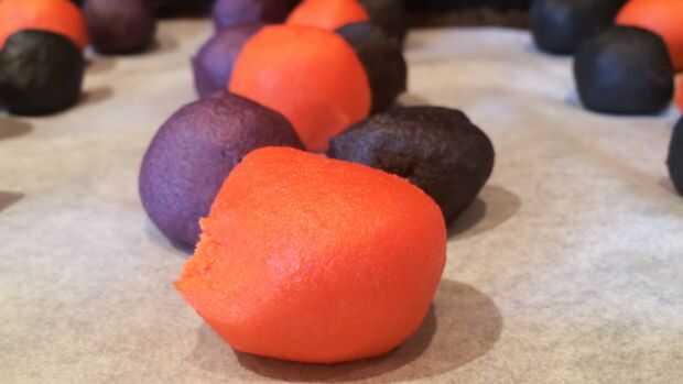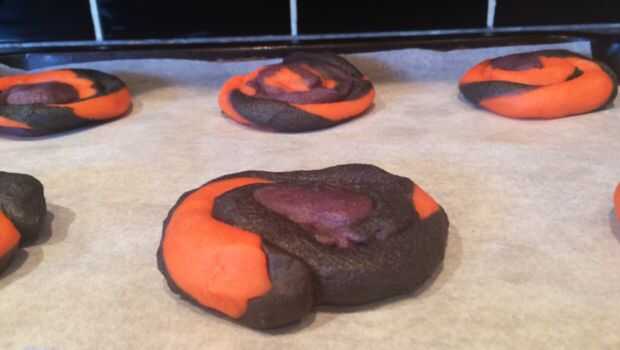 A continuación necesitamos la masa de color. Para esto utilicé el naranja, morado y negro gel colorante de alimentos. Separar la masa en 3 y añadir unas gotas de cada color a la masa. Trabajar la masa hasta que los colores son homogéneos y no se producen estrías. La masa tiende a obtener pegajosa en este punto hasta dejar enfriar en la nevera durante 30 minutos. A continuación, rodillo hacia fuera la masa en pequeñas bolas. Uno de cada color y ligeramente rodar juntos para crear una bola más grande. Rodar esta bola entre las manos para formar una tira larga, tomar un extremo de la tira y enróllela redondo para crear el efecto de remolino. Hornee a 180degrees celsius para 10-12minutes y dejar enfriar antes de servir.