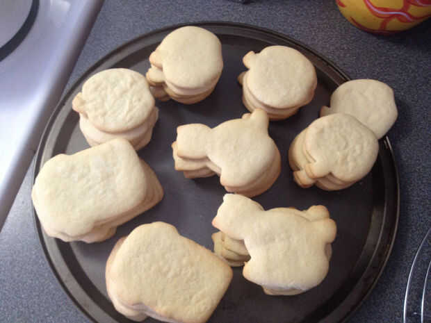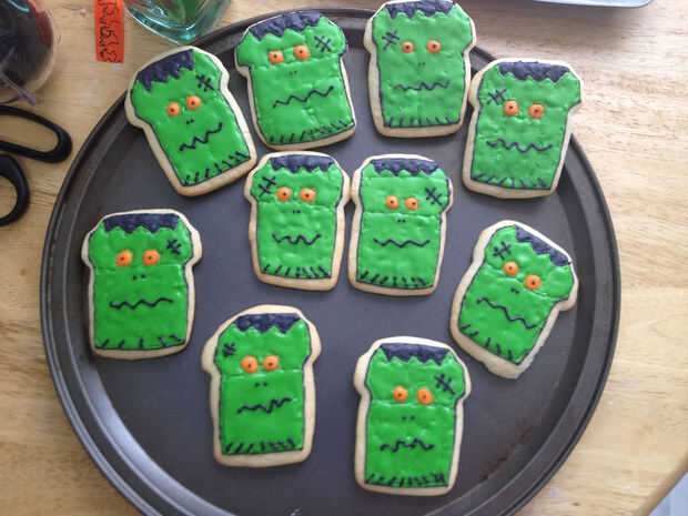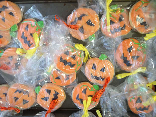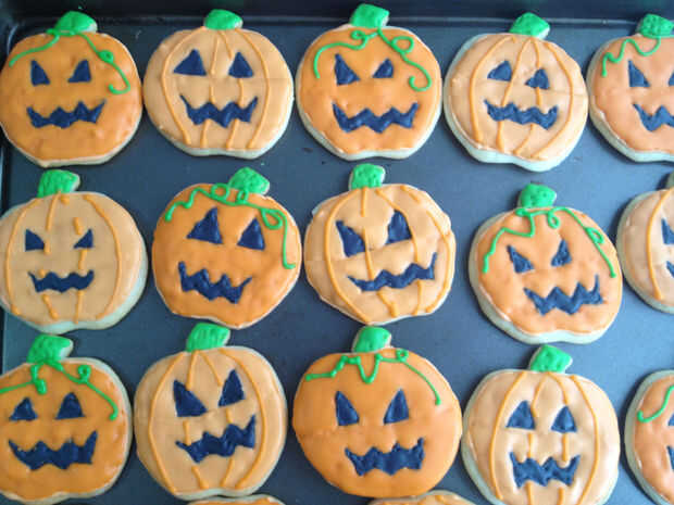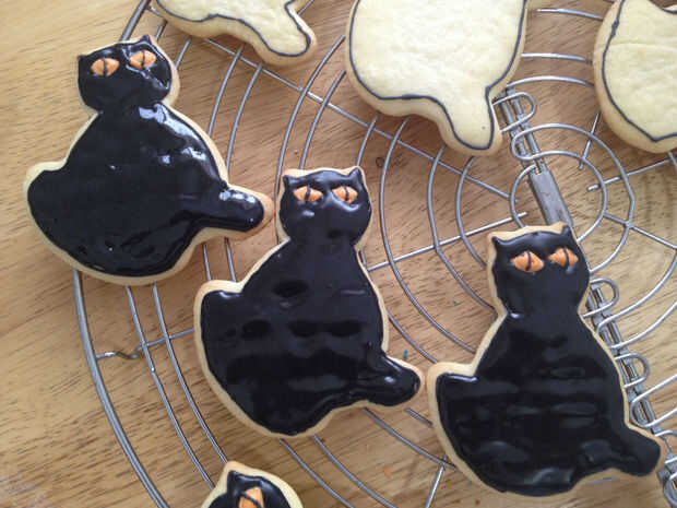 Sobre una superficie enharinada, estirar masa y cortar con cortadores de galletas con temática de Halloween y colocar en placas sin enmantecar para galletas