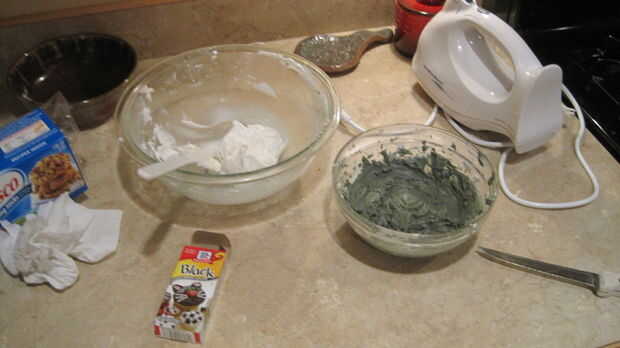 3) dividir el glaseado en dos grupos de igual tamaños manteniendo un grupo blanco y morir el otro grupo con gotas de colorante negro (usé unos quince o veinte años pero se podrían utilizar más para obtener el glaseado aún más oscuro). Apartar los tazones de fuente de baño para más tarde.