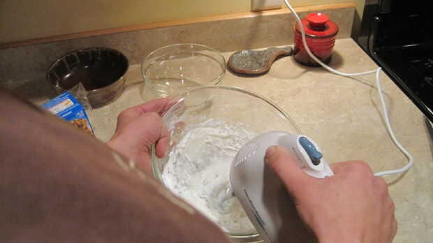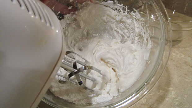 2) poco a poco la mezcla en la leche y la vainilla con una batidora eléctrica hasta que quede suave y rígida, unos 5 minutos.