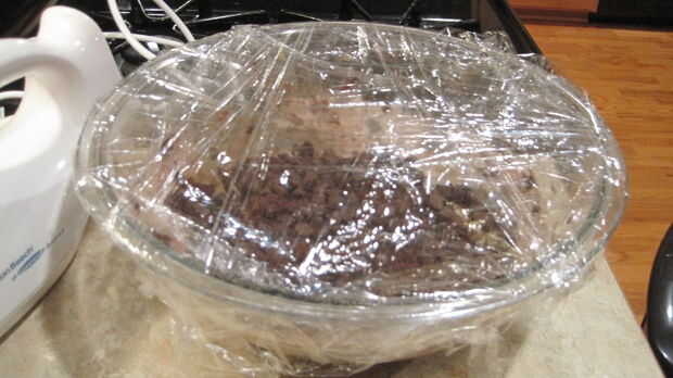 6) cubrir con un envoltorio plástico y deje reposar a temperatura ambiente hasta que la consistencia es scoopable como fuge, unos 30 minutos. Empezar a precalentar el horno a 350 grados fahrenheit (o 177 grados Celsius si te gusta más) mientras que usted espera.