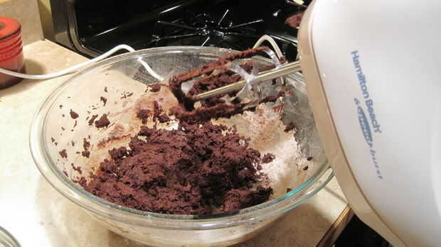 4) con la batidora a velocidad baja, añadir la harina, cacao polvo y sal de paso galleta 1 y mezclar todo hasta que uniformemente distribuida. Trate de no batir demasiado la mezcla.