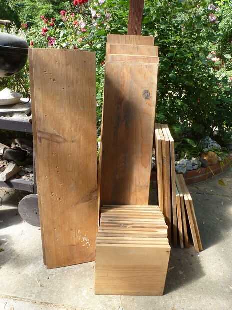 Nota: la madera que se muestra en esta imagen es sobre todo en pilas de cuatro tablas de cada longitud, difícil de ver en la foto. También, las tablas del tejado no se muestran en esta foto.
