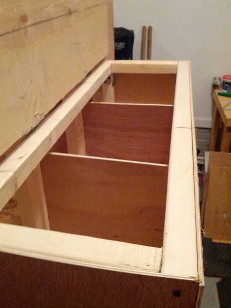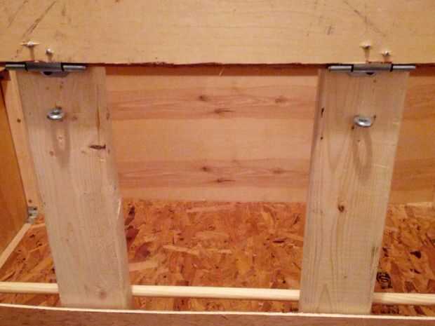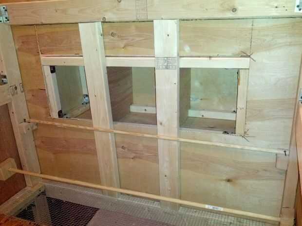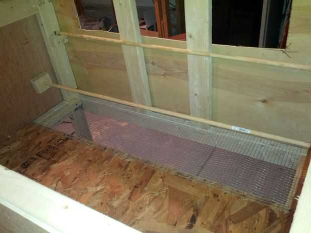 Hay un hueco de 1 pie en el piso que dos perchas están montadas por encima. Una percha se coloca directamente sobre la brecha y el otro en la parte delantera derecha de las cajas nido para que los pollos pueden saltar derecho en. El espacio está cubierto con malla de 1/2' para permitir que los excrementos de pollo caer sobre la hierba en vez de acumular en la coop.