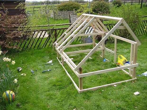 Cortar muescas de 90 grados en todas las longitudes de 4 x 2 en la figura 2 a 4cm desde el grado 45 corte extremos. (Asegúrese de que cortar en el lado correcto, más corto. Ver Fig 3). Estas se utilizarán para unir las vigas del techo en el marco de la Fig 1