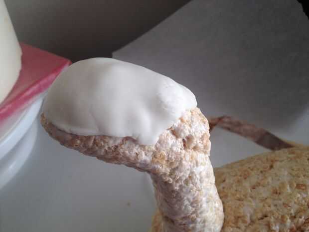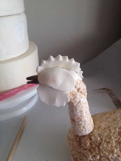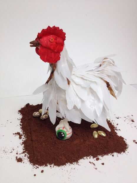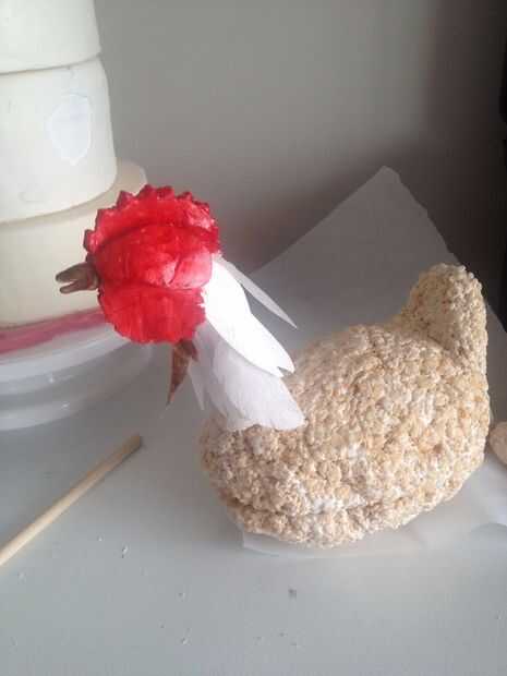 Con modelado de chocolate, cubra la parte superior del cuello, cabeza y detalles añadidos, color con colorante rojo comestible. Para los ojos de pollo, coloreado con colorante comestible