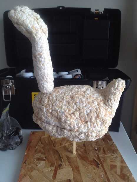 Coloque la bola del ojo gigante en pollo luego empuje en el pie de pollo en el cuerpo y, como si el pie está agarrando la bola del ojo