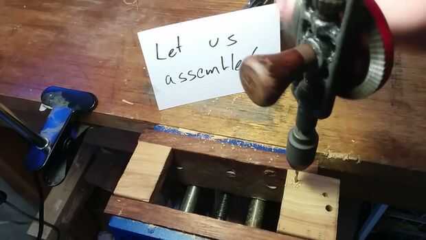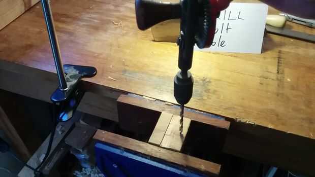 Tiempo para perforar los orificios para los tornillos de madera. Montar el soporte con un tornillo de banco o abrazadera para mantener juntos. Los tornillos se va a través de la pieza superior e inferior en la veta de la pieza posterior. Cuando elegir un taladro de poco tamaño, es mejor ir un poco más grande entonces crees que es necesario, ya que la madera puede quebrar cuando se atornilla en un agujero pequeño.