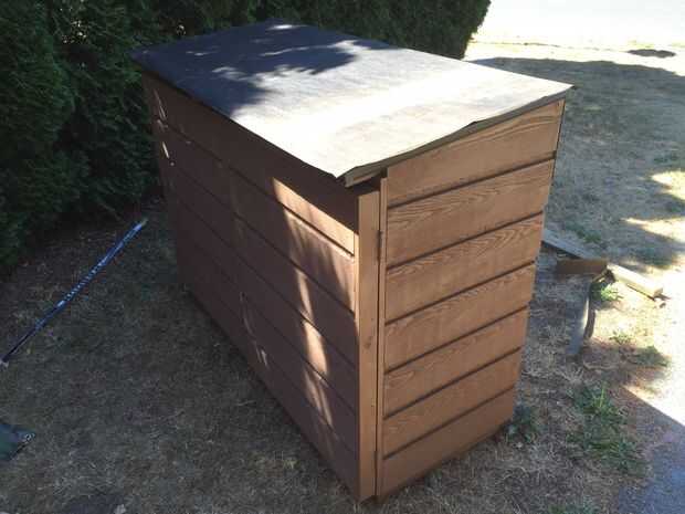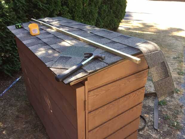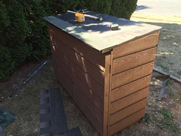 Corte una hoja de madera contrachapada de 5/8" para el techo. Borde en los lados y el frente con un perfil antigoteo. Cubra con papel de construcción. Cortar, poner y uñas en las tejas de asfalto. Para hacer la primera línea de tejas que se cubriría sobre, cortar las tapas de algunas tejas - que funcionó realmente muy bien para que luego podría utilizar la parte inferior como la línea final de las tejas. Instalación era de otra manera según las instrucciones. La cantidad de Tejas perdidas era agradablemente mínima.