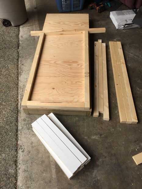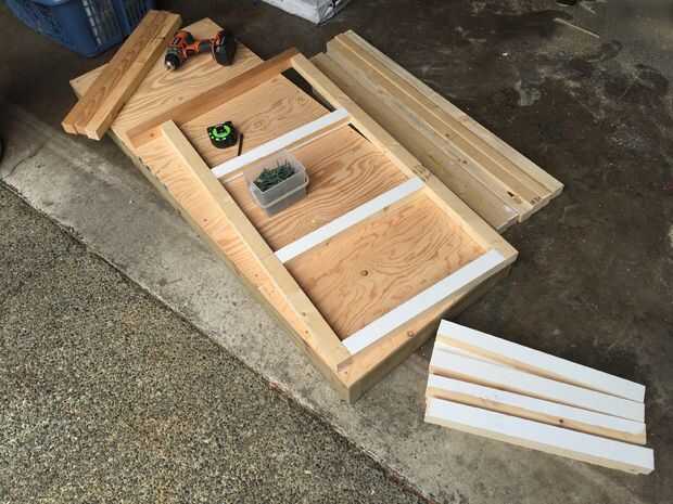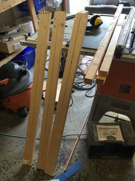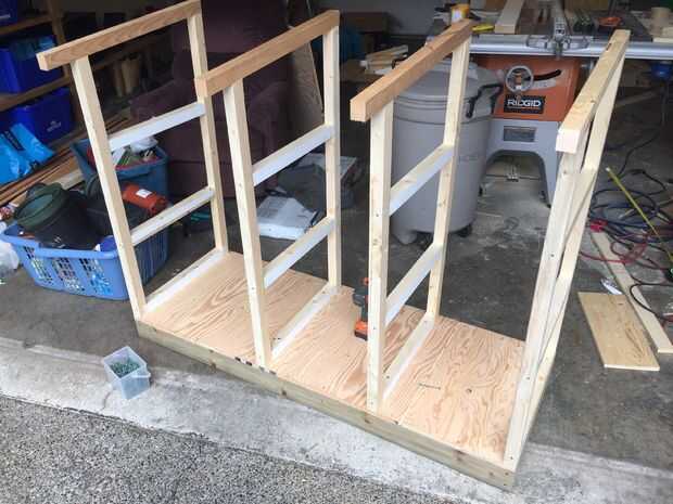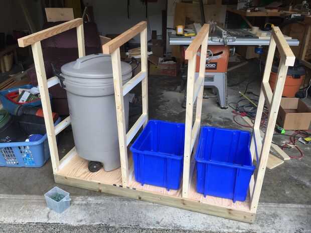 Hice 4 marcos con una inclinación de 5 grados en la parte superior de las vigas de 2 × 4 Ripeado en 2 × 2 (realmente 38 × 42 mm). Para maximizar el espacio aprovechable la inclinación del techo es sólo suficiente para drenar el agua con eficacia lejos de la casa. Universales están ahí para apoyar estantes. Había jodido los marcos a la base, uno en cada extremo y los otros dos espaciadas apropiadamente para dar cabida a los contenedores.