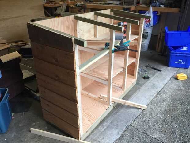 Clavó cedro revestimiento a los lados, asegurando que cubre los bordes expuestos de madera contrachapada de la base.