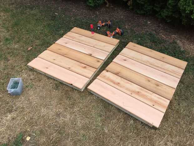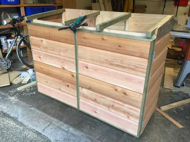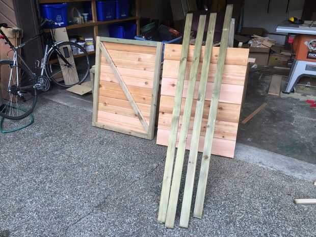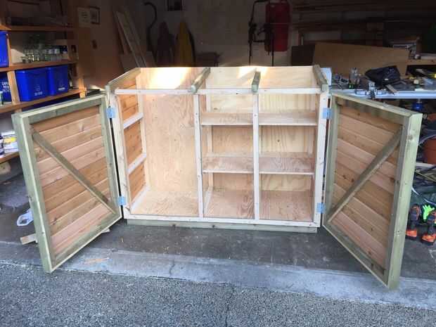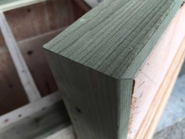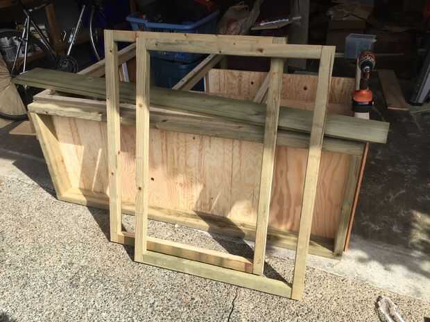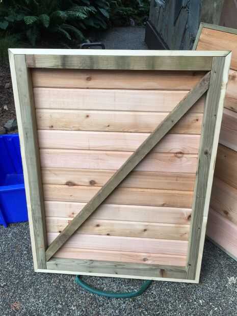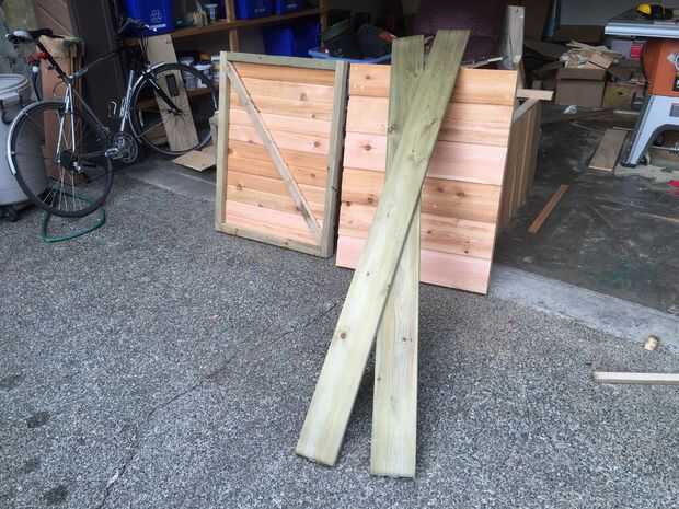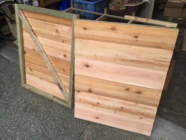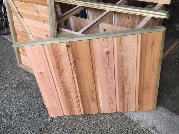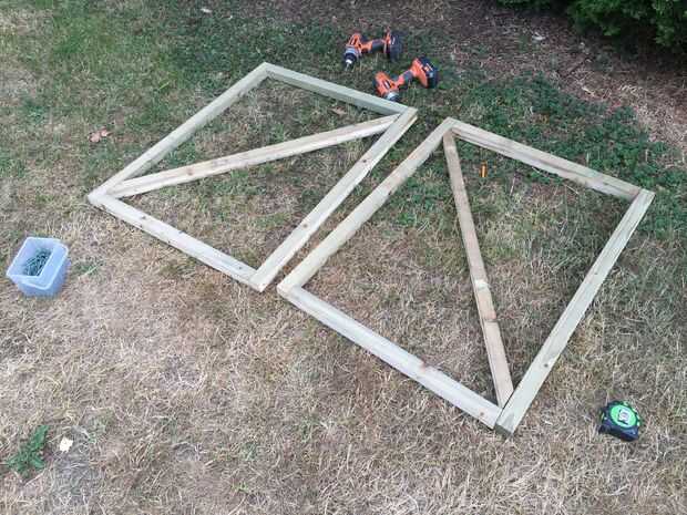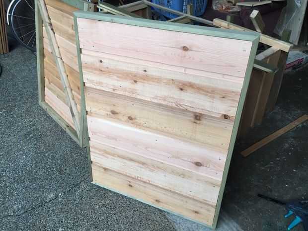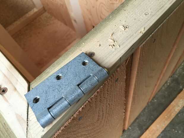 Las puertas son un simple 2 × 2 se unió a marco con una diagonales a tope. Medí las diagonales para asegurar que eran idénticos antes de marcar para el soporte. Los marcos son ante clavado en revestimiento y luego con bordes con tiras ancho 55 mm a inglete. Punta principal para buena juntas de inglete: siempre marcar en lugar de medir y usar una caja de ingletes (yo usé una sierra para cortar ingletes, que facilita las uniones perfectas). En esta etapa, añadí las bisagras y montaje de puertas. Pero realmente no aconsejo esto en retrospectiva - hacerlo una vez que la nave esté en posición. Incluso la más pequeña diferencia en la llanura de la tierra harán que las puertas no se alinean perfectamente una vez que lo mueve. También es más fácil de mover y pintar sin las puertas - la vertiente es pequeña pero pesado.