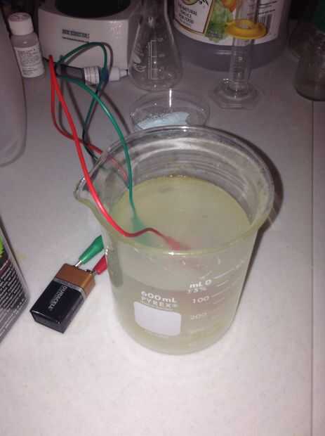 Gota en la solución de vinagre sal y compruebe en ella cada minuto o así. La solución comenzará a burbujear formando gas hidrógeno. Esto es normal