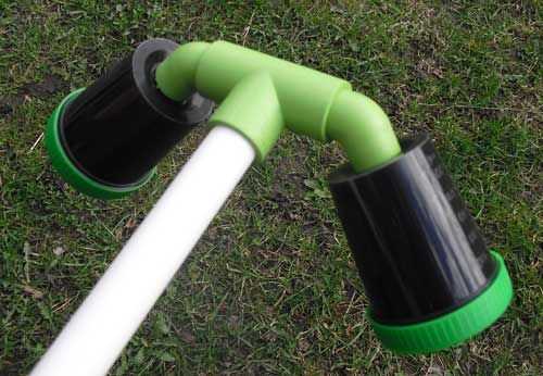 2. Estos son realmente tazas de orina – tenga cuidado al taladrarlos, se rompen fácilmente. Aquí se rocían ya desde el interior para ocultar su contenido. Puedes ver que estoy usando un tubo de agua de PVC para conectar los contenedores al cañón (también un tubo de PVC).