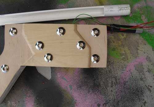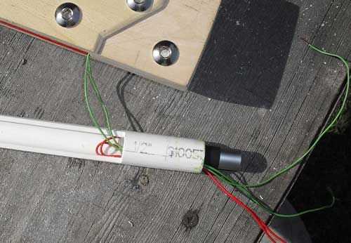 6. el láser punta ajuste apretado en el tubo de PVC y que se pega hacia fuera. Dos cables que vienen del gatillo (aquí verde) y dos van al láser (rojo).