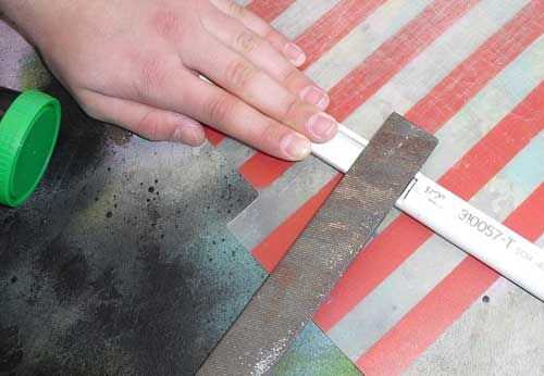 3. preparar el tubo de PVC de cañón: en la parte delantera tenemos el tubo entero para permitir que la punta de láser, mientras que el resto tiene que sentarse en la pistola, por lo tanto cortar el tubo a lo largo de su longitud. Marcar a ambos lados del tubo para obtener una igual cortar con la sierra, luego papel de lija.