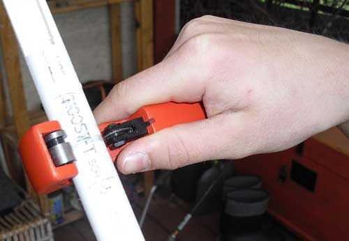 4. el tubo de 's casi listo, aún demasiado largo en la espalda y la parte delantera. Para obtener un agradable igual cortar alrededor del tubo de PVC, esta vez usé un cortador de tubos (tomó mucho más tiempo que una sierra).