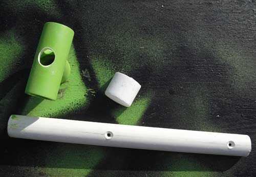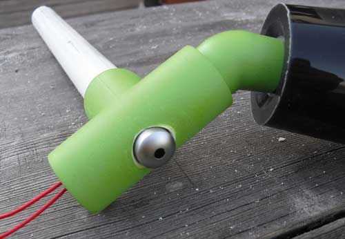 4. el cuerpo de madera y el barril de plástico. Ver los cables en sus respectivos lados. Si no va a añadir nada más, sólo tiene que conectar los extremos del lado derecho (izquierdo: rojo de + del láser a la batería, verde (cualquier) del gatillo a la - de la batería).