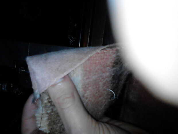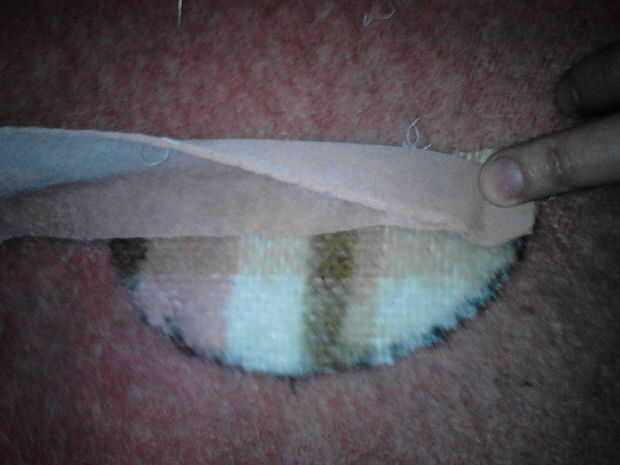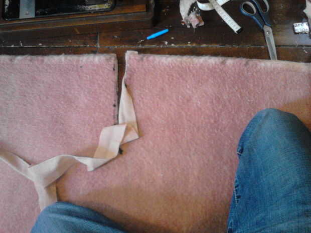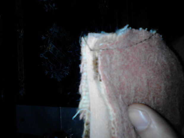 Para obtener el ajuste conjoined con la costura de la parte inferior aún siendo capaces de cubrir la costura del corte, hice una probeta tomando dos trozos de chatarra de manta y un pedazo corto de la corte. Primero doblar el corte doble y coloque ontop del pedazo de manta para que el lado abierto de la corte doblado está lejos de la costura. (imagen 3) Coloque lo otros ontop de pedazo de chatarra y coser la parte de "lado". (Foto 3, 4 y 5) Ahora usted puede voltear el testpiece revés (imagen 6) y doblar el corte sobre el borde la costura será (imagen 7 y 8).