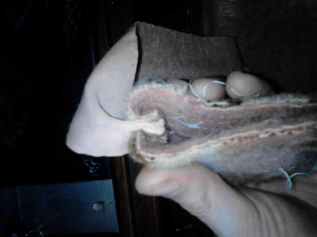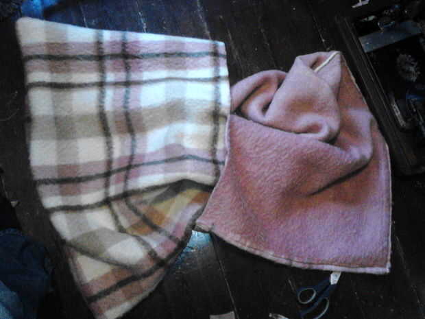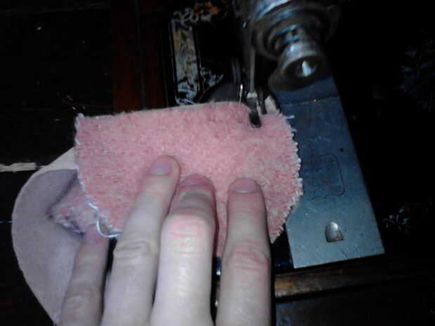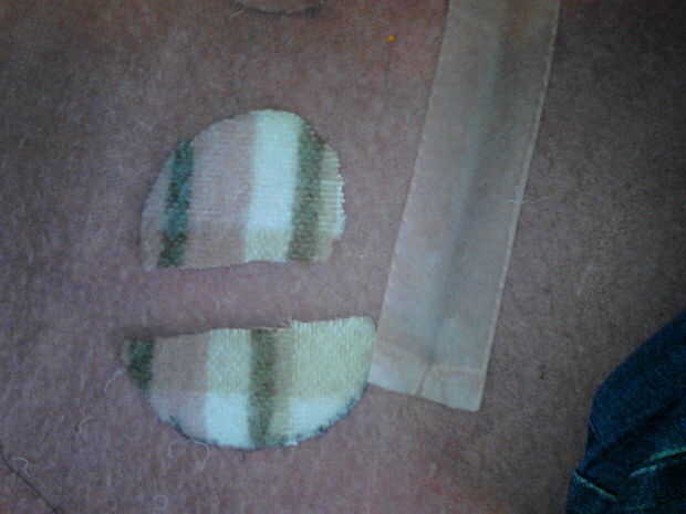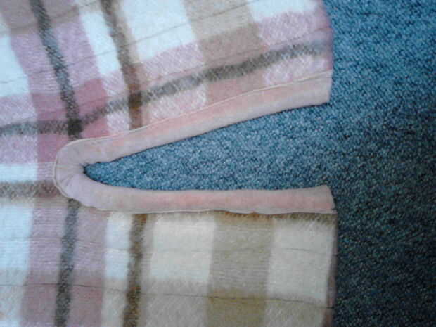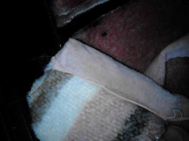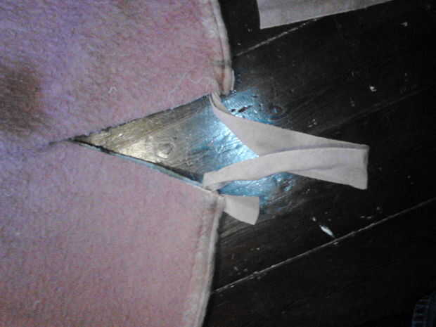 Coser por todos los bordes excepto el corte en el medio, esto asegura que el recorte está asegurado en ambos las esquinas (foto 11). Tirón de la parte interior hacia fuera (Fig. 12). Ahora puede comenzar a agregar los refuerzos (más unos 4cm de separación) hasta el corte medio. Para asegurar el medio corte y el recorte solo cosí en la corte en un lado de la parte, así coser juntos las dos capas de manta. Entonces volcó la parte, tiró el recorte sobre la costura anterior y trazó con una costura nuevo. ahora sólo tiene que añadir el medio refuerzo y se realiza.