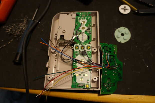 Usando un mando de Wii como el interfaz de Bluetooth y una Gameboy de matriz de punto butttons y la cáscara (dos cosas que ya tenía) pensé "¿por qué no les machaque juntos y dan un nuevo propósito?". Con el uso de la App en la App de Play store "Wii Controller IME", este retro regulador controlará realmente todo lo que le permite utilizar el teclado táctil android como entrada. Aunque sólo he probado con un emulador SNES, en teoría debe poder jugar y hacer todo tipo de cosas con los botones del Gameboy. El proyecto es esencialmente un destripado Game Boy con un Wii remote dentro. La parte difícil fue redireccionar las conexiones del botón entre los dos.