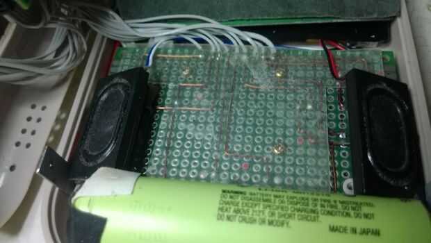 Para agregar audio necesitaba el amplificador más pequeño que pude encontrar y unos altavoces de sonido pequeño pero decente. El amplificador que he usado es una pequeñita estérea clase D, alimentado de 5V. Es tan pequeño que pude Remétala bajo el tablero del botón cerca de la tecla 'B' como se muestra en una foto. Más tarde lo cubrió con unas láminas de plástico adhesivo. La foto muestra un cable coaxial soldado a las entradas de L + R, después de vertido esa idea como el cable coaxial era demasiado gruesa y difícil de soldar para el control de volumen. Que utiliza los alambres de un cable de unidad de disco duro IDE desechado en su lugar y montar una cabecera de 90° en el amplificador PCB. Yo también cabe un pequeño 2 pines con conector en línea para el cable de 5V a la Junta Directiva de la amp por lo que puede ser solo conectado más tarde. Los altavoces que utilicé fueron rescatados desde un teléfono Nokia N95 muerto. Tuve un N95 por años y que tenía los altavoces mejor/más en un móvil que había escuchado. Por lo que el orador secciones corte lejos del resto del teléfono y luego colocadas como se muestra en las fotos, sujeta con una cinta de alambre soldada a la placa. Los pequeños contactos de cada altavoz fueron soldados a la placa y sacó a los topes en el borde inferior. El puerto de altavoces suena hacia fuera a los lados de la caja, por lo que perforé algunos pequeños agujeros de cada lado para permitir que el sonido salir (más sobre esto más adelante).