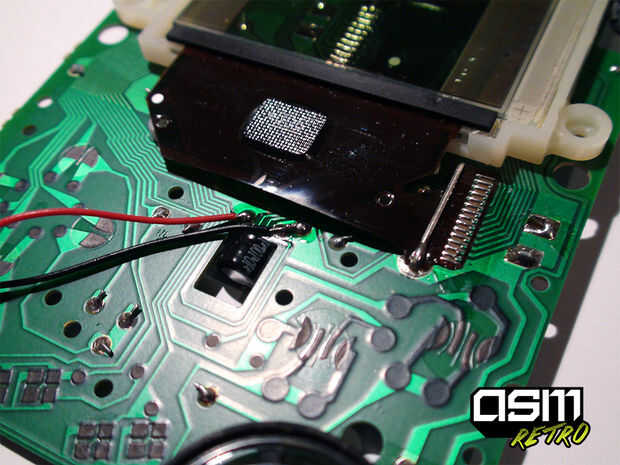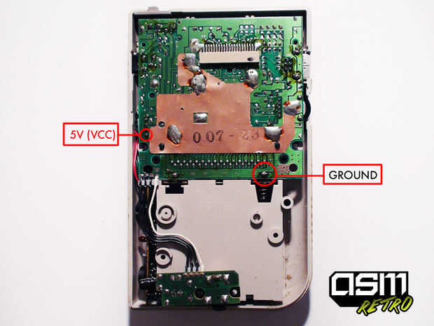 La soldadura de los dos cables que viene con el kit a los contactos expuestos. Están marcados "+" y "-" para indicar los terminales ánodo y cátodo. La tecla "+" se conecta a la fuente de alimentación de 5v en la Game Boy y el "-" pad se conecta a tierra.
