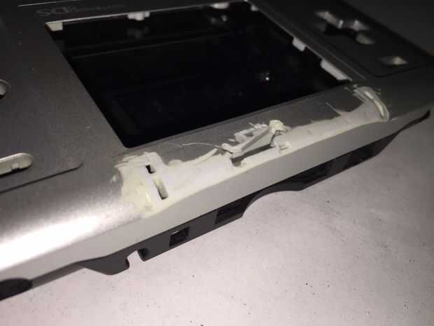 He utilizado bondo para rellenar los agujeros a la izquierda y para llenar la ranura para tarjetas DS, la ranura de la aguja y los orificios para los botones X e Y. Puede que tenga que trabajar el bondo en el interior de la caja una vez que se seca, podría obstaculizar los componentes y evitar que se cierre el caso.