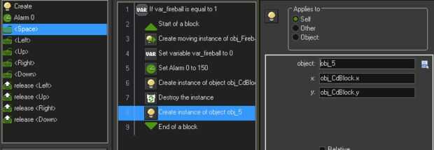 A continuación, vamos para agregar un comando más para el evento "espacio" de jugador, vamos a decir "cada vez Presione la barra espaciadora, si bola de fuego = 1, voy a crear una instancia del objeto 5 en coordenadas del bloque azul." Esto debería ser el final del if entonces declaración, todavía rodeado por esas cosas de flecha verde.