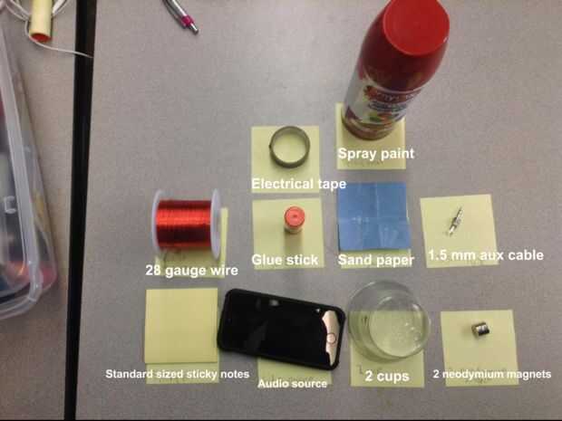 Auriculares DIYPaso 1: Reunir todos los materiales Taza plástica / taza de espuma de poliestireno2 imanes de neodimioCinta aislanteEnchufe AUXAlambre de cobre (calibre 20)Palillo del pegamentoPapel de lijaTijerasPinzas de cocodrilo (opcionales)Paso 2
