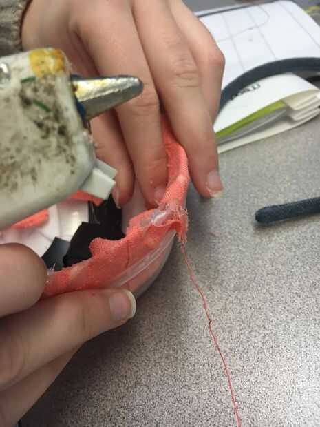 2. Con una de las tapas, pegue un pedazo de tela para el interior (con el palillo del pegamento)
