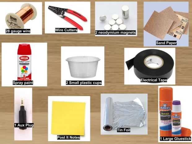 Materiales4 neodimio imanes-1 cmAlambre de cobre (28 AWG Wire)-depende en cuantas bobinas que desee (ex.25,35,45,etc.)2 diámetro de Copa de plástico-8 1/2 cm en la parte más anchaEléctrica cinta - depende de cuánto desea necesitaConector AUX - 5cmPap