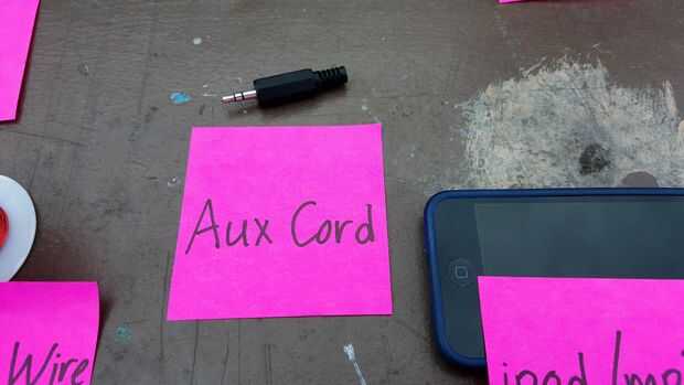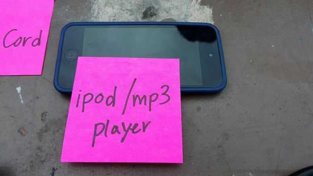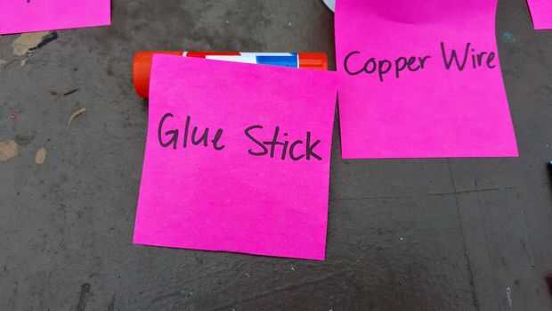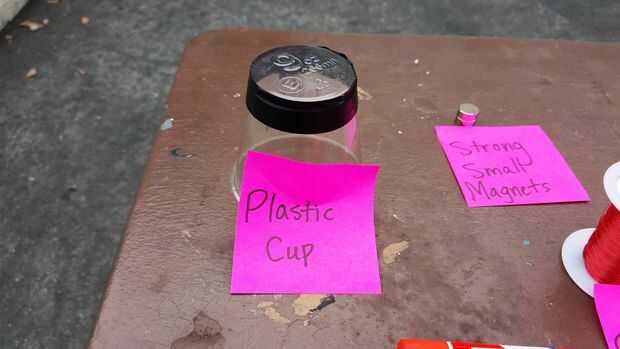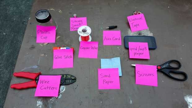 Materiales (pueden todos encontrar en Fry Electronics/Amazon/Home Depot)1 rollo de cable AWG 282 imanes de neodimio (2 cm de diámetro)2 vasos de plástico individuales2 barras de pegamentoPapel de lijaCinta aislanteCable AUXNotas Post-itTijerasCortado